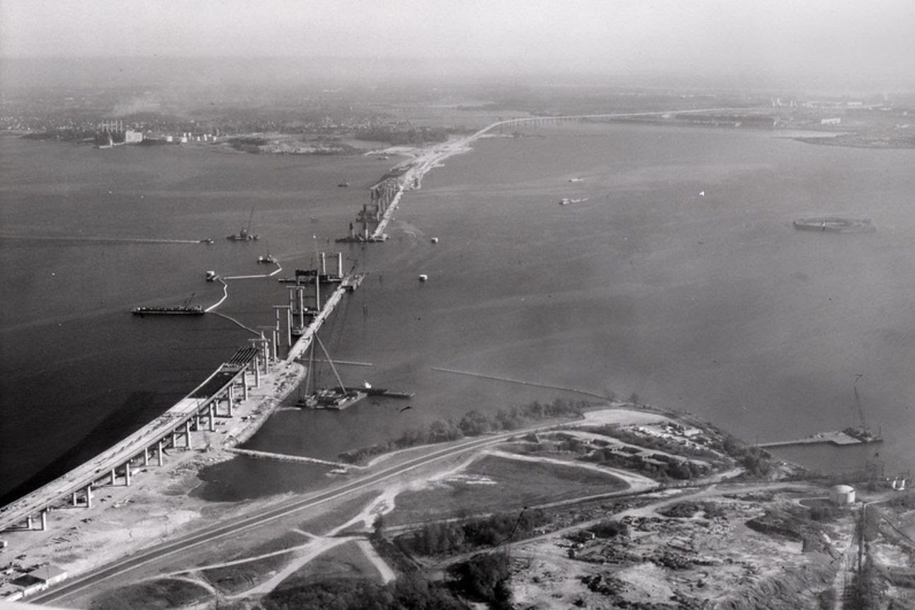 Even as the tunnel debate dragged on, construction crews pushed ahead with work on two long embankments extending from each shoreline. These weren’t speculative experiments — they were built specifically for a submerged tunnel alignment. But engineers left themselves an escape hatch: the causeways were designed so that if the plans changed, they could be repurposed for a bridge.